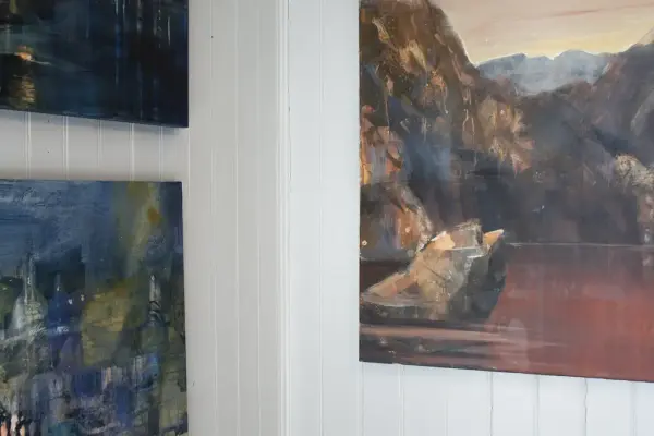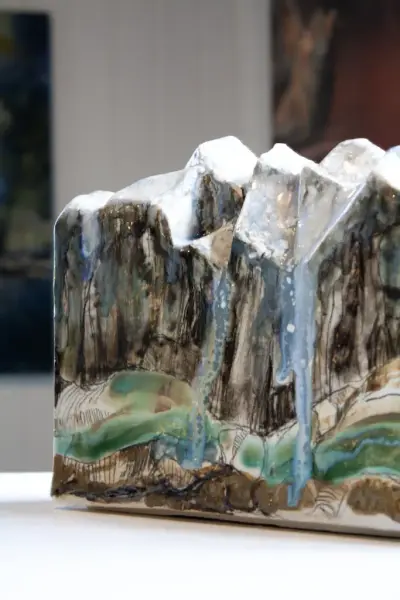 I årets utstilling møter vi naturen, og særskilt fjellene, i Holmøys malerier og Thomassens keramikk.