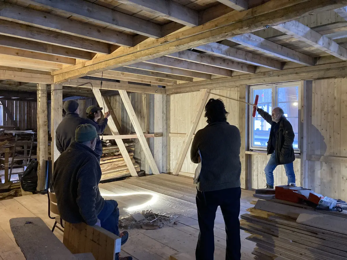 Dei har tømra og reist eit påbygg til Husasnotrabygget i Nordmørsk stavline. Med store portopningar og lange spenn har dei kompensert med kammadragarar og forspenning.